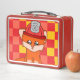 A cool lunch box featuring a firefighter (fire) like checkered pattern, a fire hat and a fox with a fire hat. The fox from the book "Firefighter Fox".