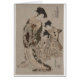 Cette impression couleur japonaise a été faite au XVIIIème siècle par Isoda Koryusai (1764 - 1788). Le nom dans le Japonais est : "Hinagata Wakana aucun Hatsu Moyo". Dans lui nous voyons une dame japonaise et ses deux préposés, tout habillés dans des kimonos longtemps débordants admirablement conçus avec de jolies conceptions de fleur. La dame porte également une certaine sorte de manteau ou écharpe dépeignant un poisson nageant en amont ou dans une cascade. L'artiste japonais a en grande partie employé des couleurs claires dans cette copie - beige, brune, blanc et noir. De même que la coutume au Japon Isoda Koryusai a signé son nom dans des caractères de kanji et des Hiragana (écriture japonaise).