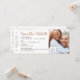 Design d'avion en cuivre ou en bronze clair sur une carte d'embarquement enregistrer la carte de date pour un thème de voyage ou un mariage de destination, avec une pièce sur le côté du billet pour une photo, Voyage et détails de l'hébergement sur le dos. Les détails amusants de police de l'ordinateur rétro comprennent des petites flèches, un code à barres et une boîte pour une assignation de sièges. Les invités de mariage de destination ont besoin de plus d'informations de voyage et d'hébergement avant un mariage local. Si vous voulez simplement sortir le mot rapidement pendant que vous élaborez les plans de voyage, le design au verso peut être supprimé, il suffit de cliquer "customiser plus loin". Paper Grape Destinations on Zazzle se spécialise dans les invitations à thème de voyage et la papeterie de mariage-jour pour le couple aventurier, nomade planifiant leurs noces à l'étranger.