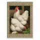 Un imprimé d'art rustique présentant un coq vigoureux et une poule dans une maison de poules. La bordure foncée ecru est motif est constituée d'éléments en spirale. Ce tirage serait un grand ajout à une décoration de maison de campagne rurale.
