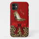 Chic iPhone 5 coque fait en rouge, sur le dessus et un tache brun et noir jaguar imprimé, sur le bas. Les graphiques d'un ruban satiné rouge et d'un arc décorent le milieu et une paire de talons de talons d'impression jaguar sont sur la moitié supérieure. Personnalisez le texte bronzé pour vous-même ou en tant qu'idée cadeau ciblée.
