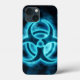 Coque iphone noir avec une conception de symbole de danger biologique bleu électrique.