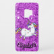 Un superbe coque Samsung Galaxy S9 violet, pétillant, avec une mignonne licorne arc-en-ciel qui saute dans l'air. Elle a une corne d'or, une crinière de couleur arc-en-ciel et une queue assortie, des étoiles d'or sur son corps et des sabots d'or, et saute au-dessus d'un lit de parties scintillant violette scintillante. Ce boîtier de téléphone unicorne coloré peut être facilement personnalisé avec votre propre nom, aussi.