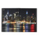 Superbe couverture iPad Air avec une photo colorée de l'horizon de New York la nuit, avec ses bâtiments éclairés se reflétant dans la rivière sombre.