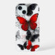 Un troupeau de papillons de morpho volants, réalistes, rouges et noirs sur un arrière - plan blanc avec des gouttes de peinture.