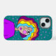 Design coloré, lumineux, abstrait d'un visage stylisé d'une fille aux cheveux rayés, avec un arrière - plan d'étoiles.