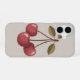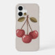 Illustration rétro de cerises stylisées groupées avec des feuilles minimalistes.
