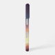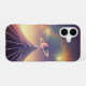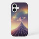 Scène rétro d'une planète lumineuse flottant au-dessus de collines incurvées dans une atmosphère cosmique douce.