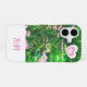 A pretty iPhone case with photographic design of pink wildflowers and grass, with cute hearts and custom initials