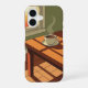 Retro illustration of a coffee cup placed near a window with geometric shadows at sunrise.