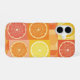 Motif rétro présentant des fruits d'agrumes stylisés avec des couleurs douces et des formes géométriques.
