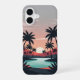 Illustration rétro d'une oasis avec des palmiers stylisés et de l'eau calme dans une palette chaude et nostalgique.
