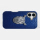 Protect your phone with the symbol of unstoppable power. This luxury iPhone 16 case features a metallic silver geometric rhino head in a sharp 3D chrome style. The industrial design is set against a premium cobalt blue python snakeskin texture, perfect for those who value strength and modern minimalist art.