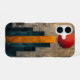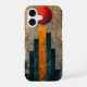 This geometric artwork centers on a vivid red circular form hovering above stacked vertical blocks in deep teal, dark turquoise, and rich mustard yellow. The background is textured with warm beige, muted brown, and subtle gray scratches, giving it an aged, industrial feel. Fine linear markings in charcoal black create a network of abstract lines across the surface. The strong contrast between crimson red, golden ochre, and cool blue-green tones produces striking visual tension. The art style reflects modern geometric abstraction influenced by constructivism and mid-century modern design, emphasizing clean shapes, balanced symmetry, and a harmonious interplay between bold color fields and distressed textures.