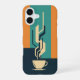 Une tasse à café stylisée avec de la vapeur géométrique dans un cadre rétro coloré et apaisant.