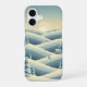 A serene retro winter landscape showing soft snowy hills in muted cool tones.