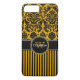 Ce coque personnalisé couleur or jaune et noir Coque-Mate personnalisé iPhone 7 a un motif arrière - plan damassé et rayé avec une bande et un cercle noir et blanc pour ajouter votre nom, initiales, monogramme ou autre texte à. Ce nouveau coque moderne et branché fait une déclaration chic pour le jeune fashionista branché ! Si vous avez besoin d'aide, envoyez un courriel à niteowlstudio@gmail.com.