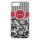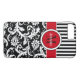 Ce coque personnalisé en noir et blanc Coque-Mate personnalisé iPhone 7 a un damas floral et rayé arrière - plan motif avec une bande et un cercle rouge et blanc pour ajouter votre nom, initiales, monogramme ou autre texte à. Ce nouveau coque moderne et branché fait une déclaration chic pour le jeune fashionista branché ! Si vous avez besoin d'aide, envoyez un courriel à niteowlstudio@gmail.com.