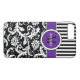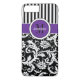 Ce coque personnalisé en noir et blanc Coque-Mate personnalisé iPhone 7 a un damas floral et rayé arrière - plan motif avec une bande et un cercle violet et blanc pour ajouter votre nom, initiales, monogramme ou autre texte à. Ce nouveau coque moderne et branché fait une déclaration chic pour le jeune fashionista branché ! Si vous avez besoin d'aide, envoyez un courriel à niteowlstudio@gmail.com.