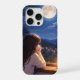 This serene illustration captures a quiet, introspective moment as a young girl gazes out of her window at the luminous full moon. The soft glow of moonlight fills the night sky, casting a calming blue hue over the distant hills and the warmly lit village below, creating a beautiful contrast between solitude and life.