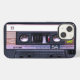 view of a vintage audio cassette tape. The focus is on the golden spools, which are the central elements of the image. The black plastic casing of the cassette provides a stark contrast, highlighting the metallic sheen of the spools. The embossed text on the cassette,