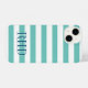 Turquoise bleu et blanc rayures nautiques nom personnalisé iPhone 14 Coque. Mignonne couverture de téléphone à thème maritime avec bande audacieuse. Couleur arrière - plan personnalisée. Ajoutez vos propres initiales de nom ou de monogramme. Idée cadeau de Noël ou d'anniversaire cool pour les hommes, les femmes et les enfants.