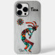 Personnalisez ce boîtier de téléphone portable Kokopelli "One of a Kind" unique ! Il présente un Kokopelli Sud-Ouest en Turquoise, Orange et Noir Jouer la Flûte et Danser sous le soleil sur un Arrière - plan d'argent! Art graphique original créé par l'artiste Kerry Miller.
