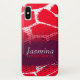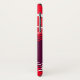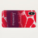 Coque iphone aux motifs animaux clairs dans des tons rouges, blancs et violets audacieux. Personnalisez cet objet avec votre nom complet. Cet exemple est actuellement le suivant : Jasmina Henderson. Le design motif original de Sarah Trett, est basé sur le dessin trouvé sur une girafe avec une superposition à mi-teinte en motif.