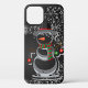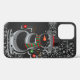 Un étui de téléphone festif avec un joyeux bonhomme de neige orné d'un casquette noir et d'une écharpe rouge et verte vibrante, le bonhomme de neige a un nez de carotte orange vif et tient des ornements dans chaque main.