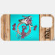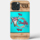 Personnalisez ce coque iphone unique "One of a Kind" Cowgirl. Il est doté d'un crâne de vache niché dans des fleurs et plumes roses et violettes, avec une corde sur un Arrière - plan turquoise, des bordures de bois Brown clair et la citation... "I'm Country Y'all" ! Design artistique original par l'artiste Kerry Miller.