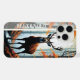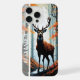 Illustration audacieuse et vibrante d'un cerf majestueux debout près d'un ruisseau dans une forêt automnale verdoyante. Les teintes chaudes du feuillage d'automne soulignent la sérénité et la beauté de la transformation saisonnière de la nature.