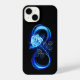 Luminous infinity symbol with glowing, beautiful, lushly blooming rose made of blue flames on black background.