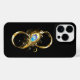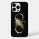 Or, symbole brillant de l'infini, décoré de bijoux plumes paon avec turquoise sur arrière - plan noir.