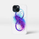 Symbole d'infini avec une belle plume peinte en violet et bleu couleurs vives sur l'arrière - plan blanc.
