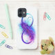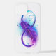 Infinity symbole with a beautiful feather painted in purple and blue bright colors on white background