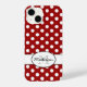 Personnalisez le coque iphone à la mode rétro avec votre initiale et votre nom. Motif rétro Cool adorable avec points blancs et arrière - plan rouge foncé.