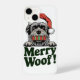 Ce design présente un chien brun noir et blanc, peut-être un Schnauzer, portant un chapeau festif de Père Noël. Le chien regarde au-dessus d'une frontière avec le texte "Merry Woof !" écrit en vert en dessous. La texture détaillée de la fourrure et les yeux expressifs du chien ajoutent au charme, tandis que le design d'ensemble dégage un thème festif de vacances, mêlant des éléments de la joie de Noël avec la gentillesse de l'animal