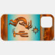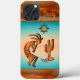 Personnalisez ce coque iphone cellulaire unique "Un d'un genre" au sud-ouest de Kokopelli! Il comprend une Kokopelli sud-ouest en cuivre jouant de la Flûte et dansant autour d'un cactus sous le soleil sur un Arrière - plan de coucher de soleil turquoise et orange..Entouré de frontières en cuivre! ! Design D'Art Original Par L'Artiste Kerry Miller.