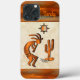 Personnalisez ce coque iphone cellulaire unique "Un d'un genre" au sud-ouest de Kokopelli! Il comprend une Kokopelli sud-ouest en cuivre jouant la Flûte et dansant autour d'un cactus sous le soleil...sur un Arrière - plan de grès...Entouré de Frontières de Cuivre ! ! Design D'Art Original Par L'Artiste Kerry Miller.