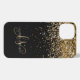 Glam Gold Parties scintillant Élégant coque iphone Monogramme. Personnalisez facilement ce design branché de boîtier de téléphone chic avec une élégante parties scintillant dorée brillante sur un arrière - plan noir. Le design comprend votre monogramme manuscrit avec de jolis tourbillons et nom.