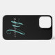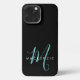 Coque de téléphone 13 à monogramme élégant moderne noir sarcelle. Un monogramme élégant de script sarcelle associé à une police sans empattements blanche et épurée donne un look contemporain.