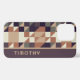 Contemporain aubergine violet, ivoire blanc cassé, brun tan, taupe, beige et vert olive carrés et triangles motif en polygon. Avec place pour customiser ou personnaliser avec un nom, monogramme ou initiales de votre choix. Belle couverture moderne et cool pour le brancheur tendance et amateur d'art branché, amoureux de motifs artistiques qui veut protéger leur téléphone de la poussière et de la saleté, de l'usure et de la déchirure. Cette conception est disponible en Apple iPhone 6, 7, 8, 10 ou X, XR, XS, 11, 12, 13 Mini, 14, et 15 coques de téléphones portables Pro Max. Montrez votre style, regardez à la mode, et sentez élégant avec un design unique sur un accessoire mobile de votre choix.