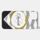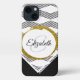 Ce design de zag zig noir et blanc accrocheur le haut de cette couverture de téléphone d'idée cadeau avec un ovale de faux parties scintillant or avec nom et lettre initiale texte modèle monogramme sur un fond noir. Remplissez le champ modèle, supprimez l'un des éléments de texte ou modifiez-les à l'aide de l'outil de conception pour sélectionner un style de police, une taille et une couleur que vous souhaitez.