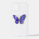 Bijoux, bleu, saphir, papillon fleur scintillant avec aile décorée de fleurs bleues précieuses avec feuilles dorées sur fond blanc.