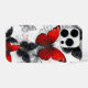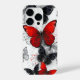 Un troupeau de papillons de morpho volants, réalistes, rouges et noirs sur un arrière - plan blanc avec des gouttes de peinture.