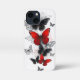 Un troupeau de papillons de morpho volants, réalistes, rouges et noirs sur un arrière - plan blanc avec des gouttes de peinture.