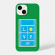 court de tennis monogrammed sur mesure iPhone 14 Coque. Idée cadeau d'anniversaire cool pour amoureux du tennis, ventilateur, joueur, entraîneur etc. Couleurs bleu et vert ou personnalisées. Personnalisez avec votre propre nom des initiales monographiques. ADORE le design de balle de tennis jaune.