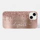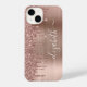 Personnalisé coque iphone élégant et girly avec rose dégoulinant parties scintillant en or faux sur un rose en or faux brossé arrière - plan métallique. Personnalisez avec votre nom dans un élégant script blanc tendance avec des swashes.