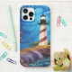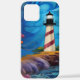 Beau phare rayé rouge et blanc sur une rocheuse surélevée entourée de fleurs et bleu eau/ciel IA Art créé par minx267