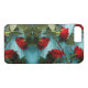 Un étui téléphonique avec un motif de roses rouges avec feuilles verts et tiges sur un arrière - plan en bois bleu. Les roses sont disposés dans un motif éparpillé, avec quelques roses entièrement fleuris et d'autres encore dans l'oeuf. L'arrière - plan en bois est d'un bleu clair avec des grains de bois visibles. L'ensemble est romantique et fleuri.
